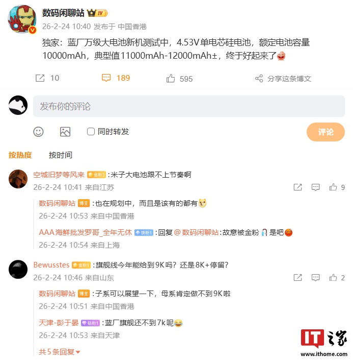 IT之家 2 月 24 日消息,博主 @数码闲聊站 今日发文透露,蓝厂(vivo)万级大电池新机测试中,采用 4.53V 单电芯硅电池,额定电池容量 10000mAh,典型值为 11000mAh-12000mAh±。